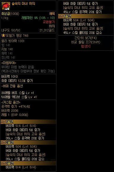 伤害增加和增益强度选项以105 Lv装备的选项等级1表示。
